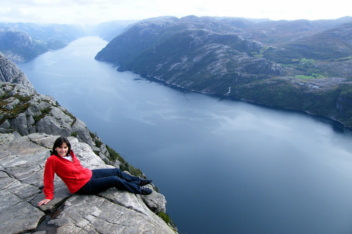 ¡Sí! No quedaba nada para subir al Púlpito y el día estaba totalmente claro. Cuando nos arrimamos al borde de la montaña nos quedamos sin habla. Realmente no había nada que decir y simplemente nos quedamos perplejos con el paisaje que teníamos ante nuestros ojos. Si el día anterior con toda la niebla predecíamos la altura, hoy la sentían nuestros ojos, la cabeza y directamente nuestras piernas con ese típico cosquilleo que te sube por todo el cuerpo. Anduvimos junto al borde para llegar hasta el púlpito y pasamos por alguna roca cercana a la caída. Lo mejor era no mirar al vacío… pero eso es inevitable.