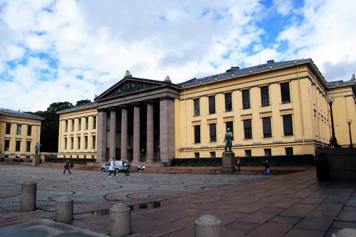 Justo en frente de la residencia Real hay una estatua ecuestre del Rey Karl Johans (el mismo que da nombre a la calle por la que habíamos pasado) ocupando un poco de espacio de una explanada enorme de arena. El edificio, de estilo neoclásico, se empezó a construir en el año 1825 pero no se vio terminado hasta 24 años después y encima nunca llegó a tener la imagen que en un principio se tenía pensado en forma de H y quedó solo en forma de U por falta de presupuesto. La guardia real, perteneciente al ejército noruego, lo custodia en sus garitas y tienen un aspecto muy similar a la guardia británica, pero parecen algo menos estrictos.